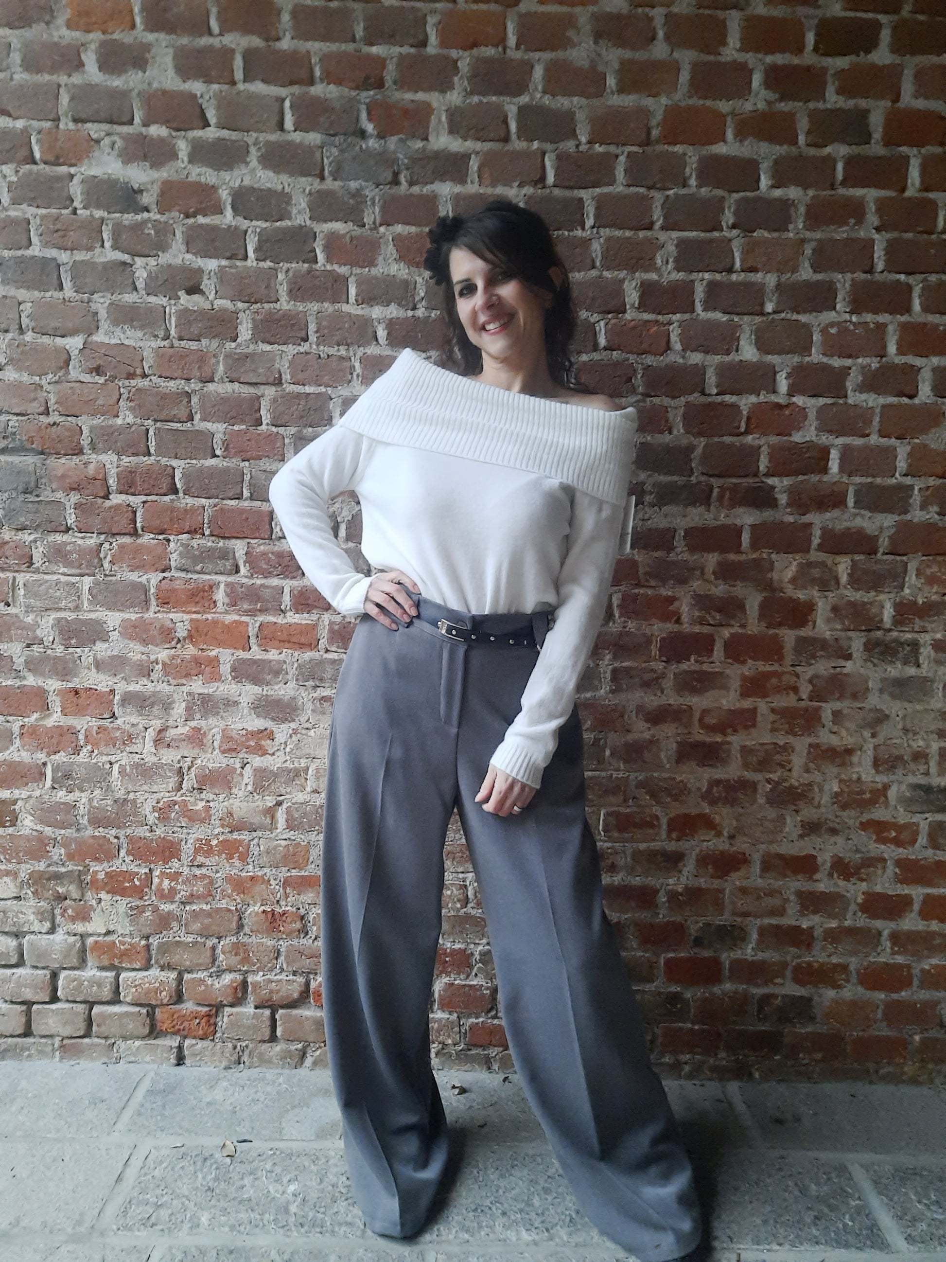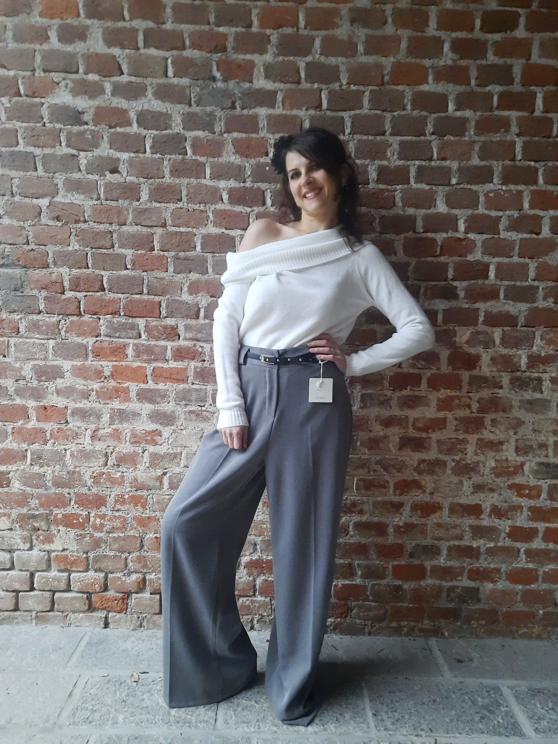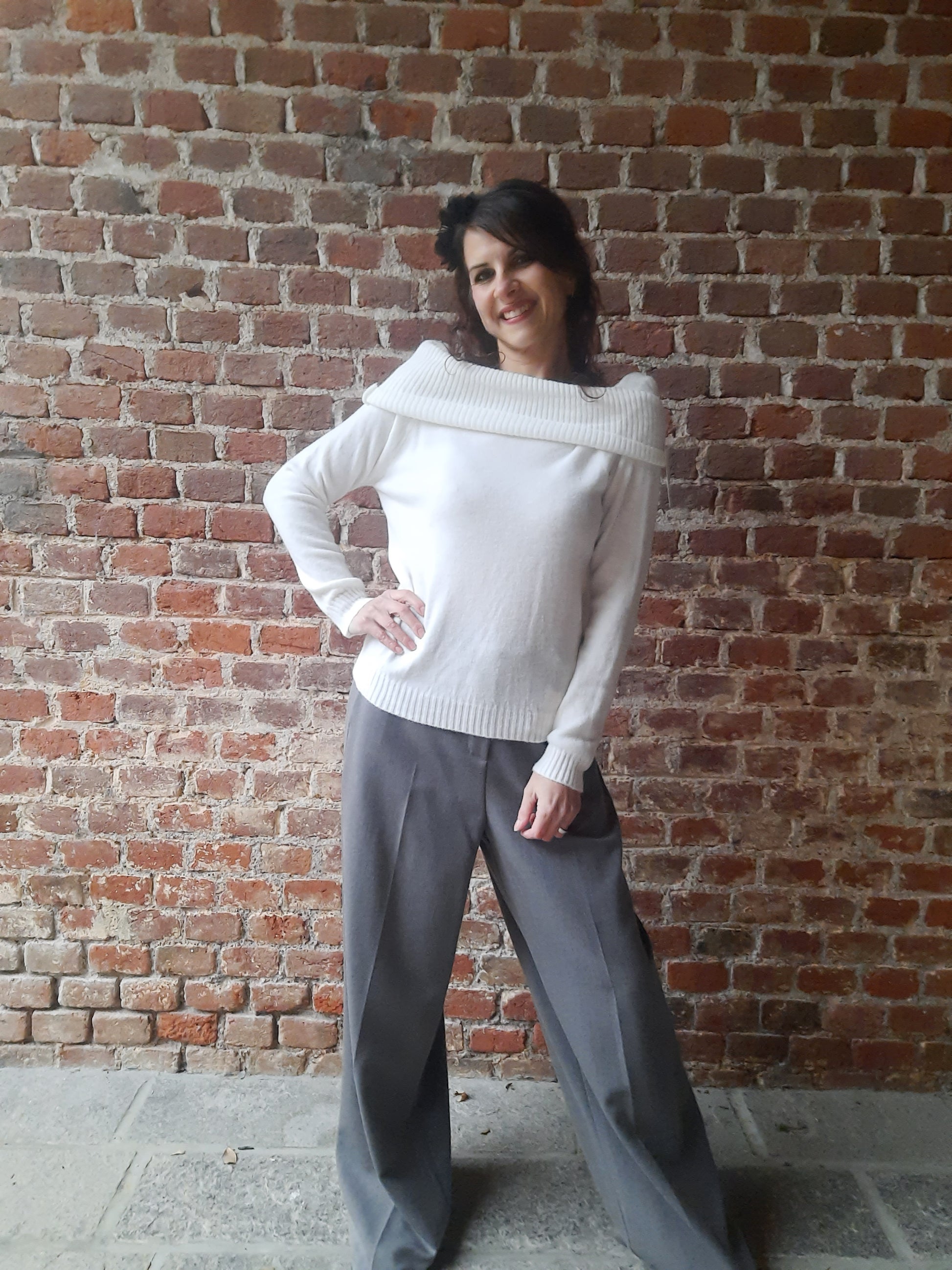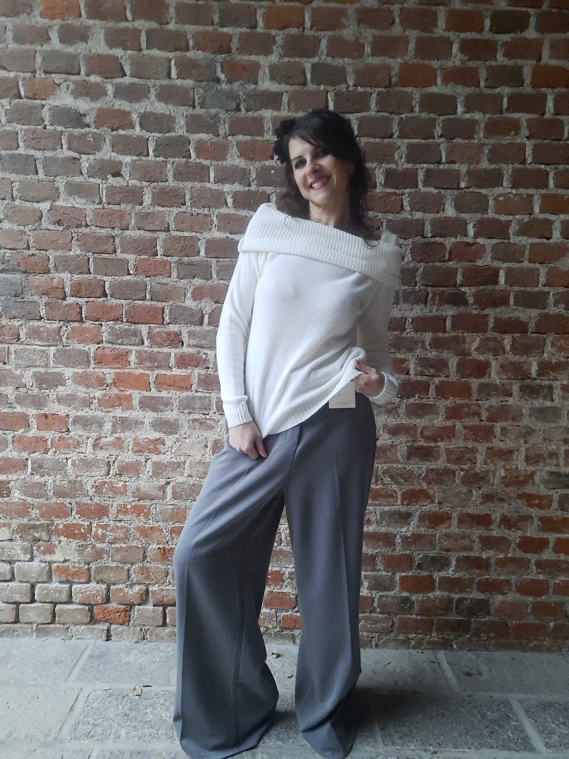 Un morbido e caldo maglioncino in tinta unita, lunghezza ai fianchi e fit aderente. La sua particolarità risiede nello scollo a barca molto ampio, infatti si può utilizzare sia tirato sulle spalle sia sceso su entrambe, oppure solo su una mantenendo l'altra coperta.