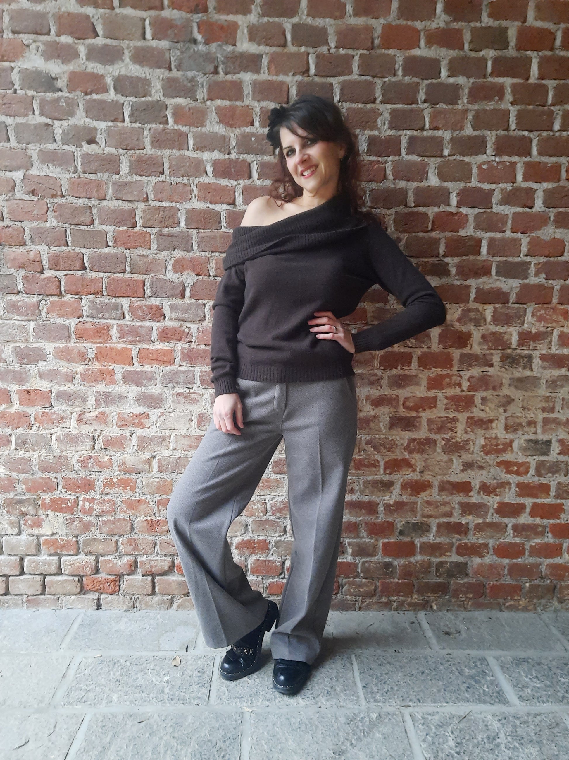 Un morbido e caldo maglioncino in tinta unita, lunghezza ai fianchi e fit aderente. La sua particolarità risiede nello scollo a barca molto ampio, infatti si può utilizzare sia tirato sulle spalle sia sceso su entrambe, oppure solo su una mantenendo l'altra coperta.