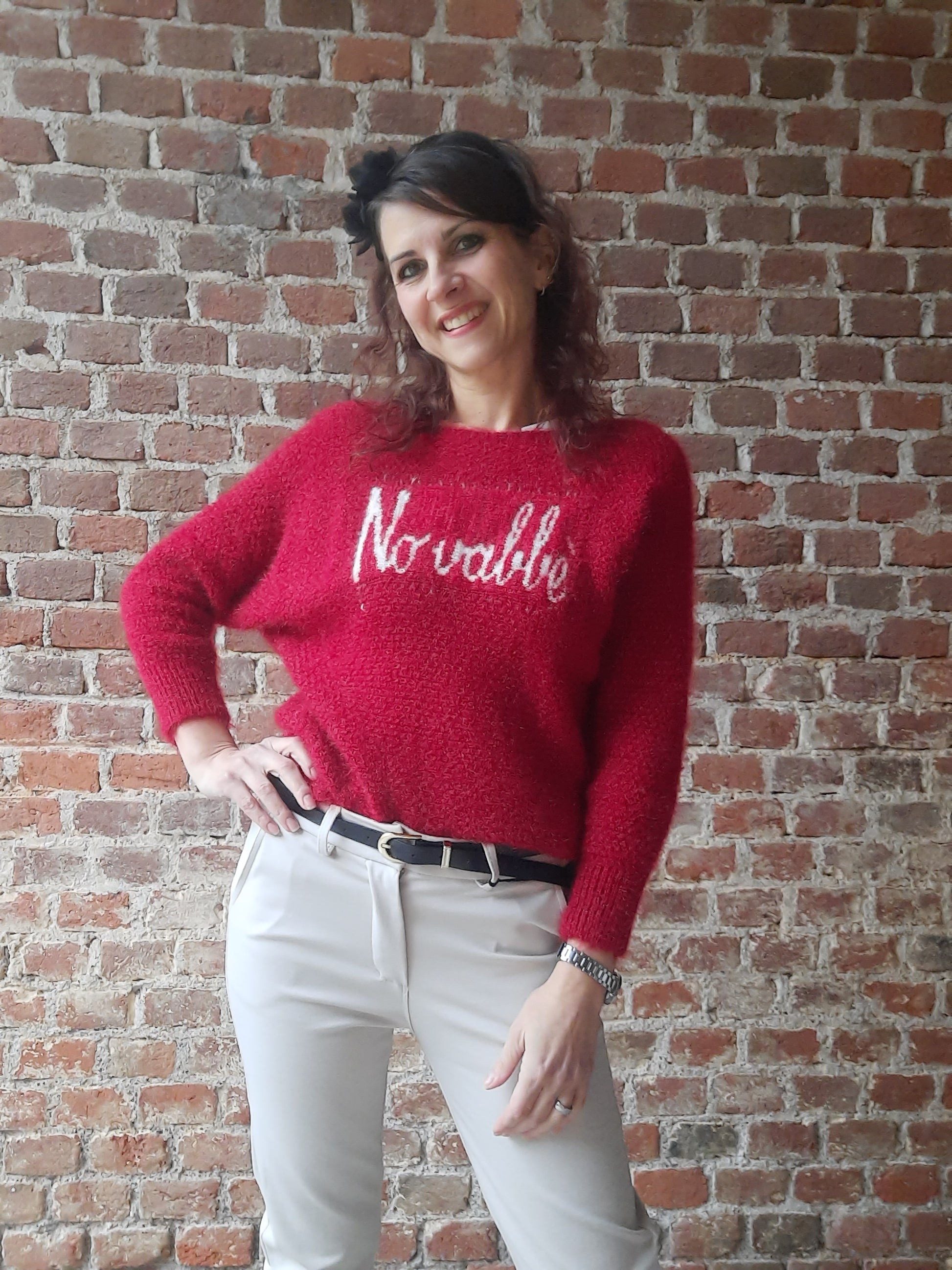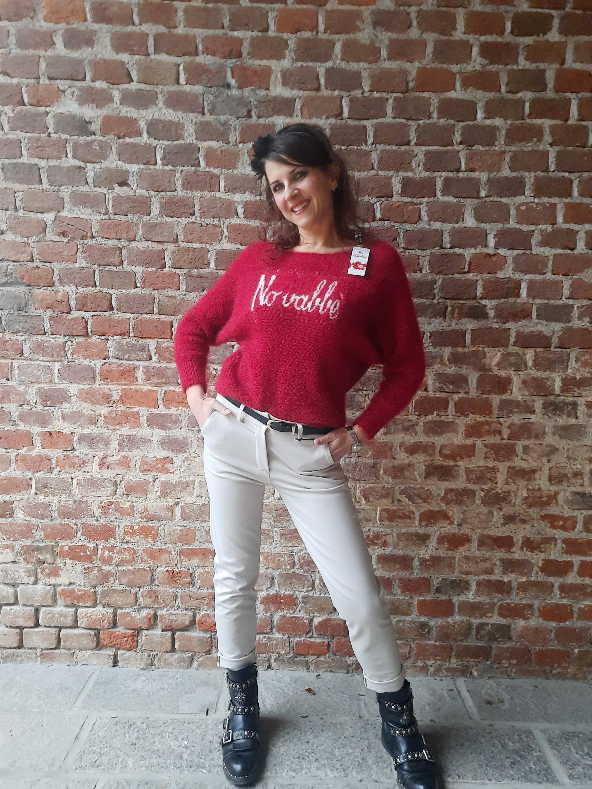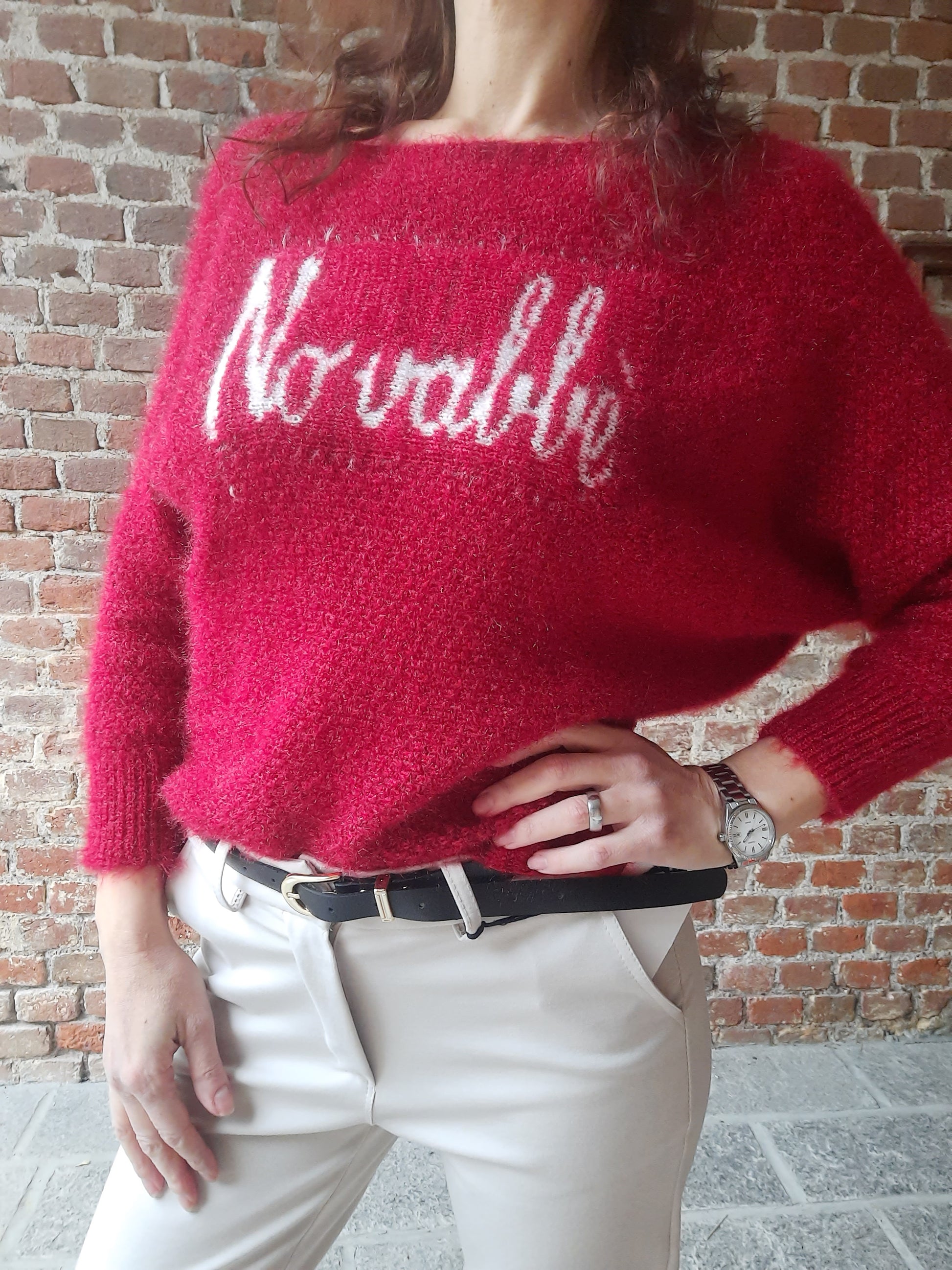 Caldo e morbido maglioncino con le maniche leggermente a pipistrello e collo a barchetta. Sul davanti una simpatica scritta "No Vabbè" in contrasto per essere in tendenza. Lunghezza in vita e tessuto effetto "peluche".