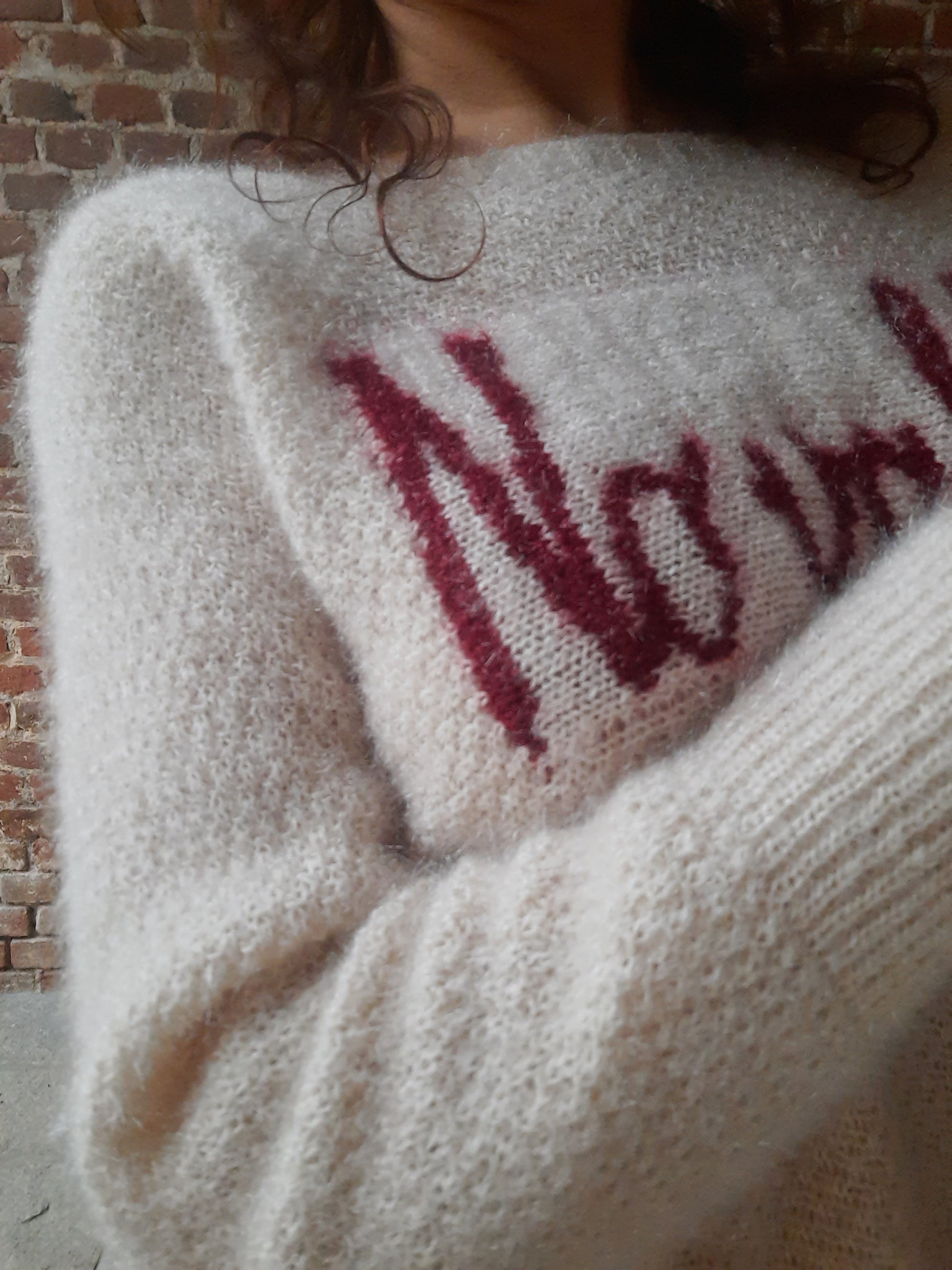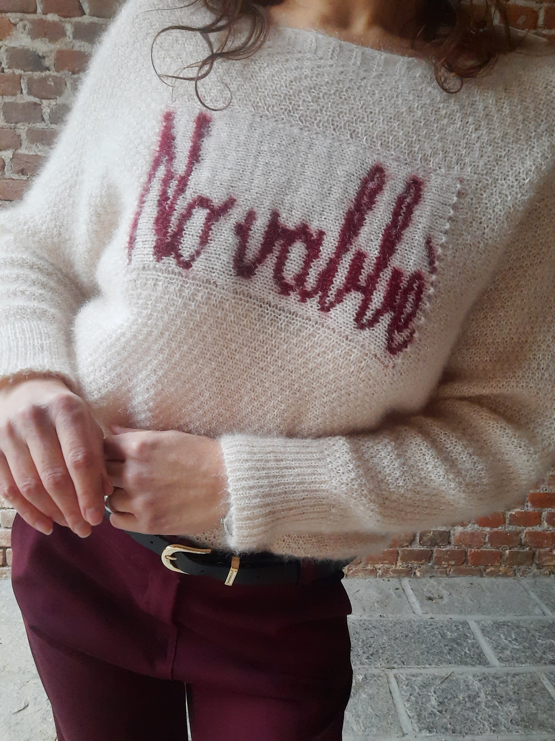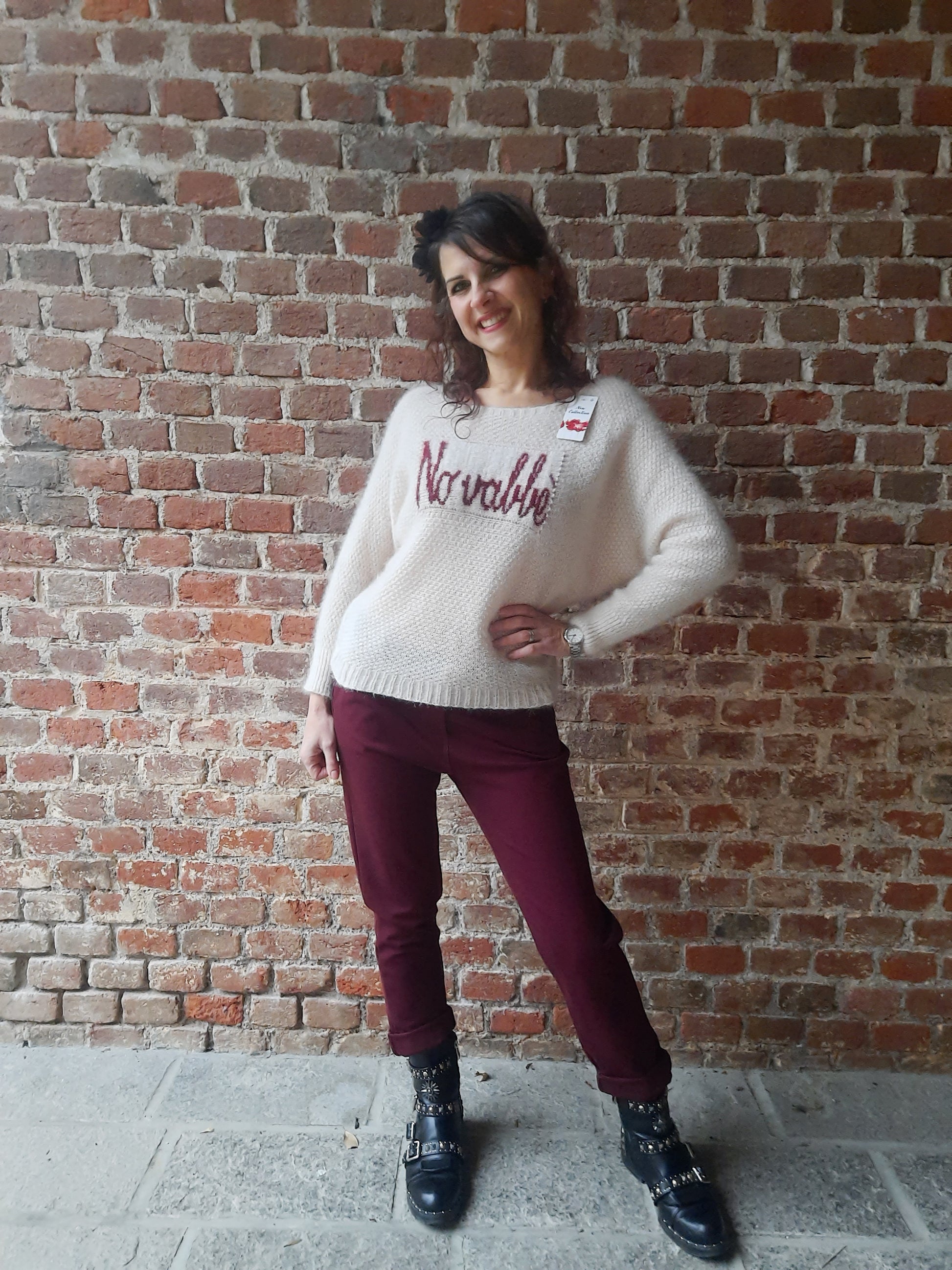 Caldo e morbido maglioncino con le maniche leggermente a pipistrello e collo a barchetta. Sul davanti una simpatica scritta "No Vabbè" in contrasto per essere in tendenza. Lunghezza in vita e tessuto effetto "peluche".